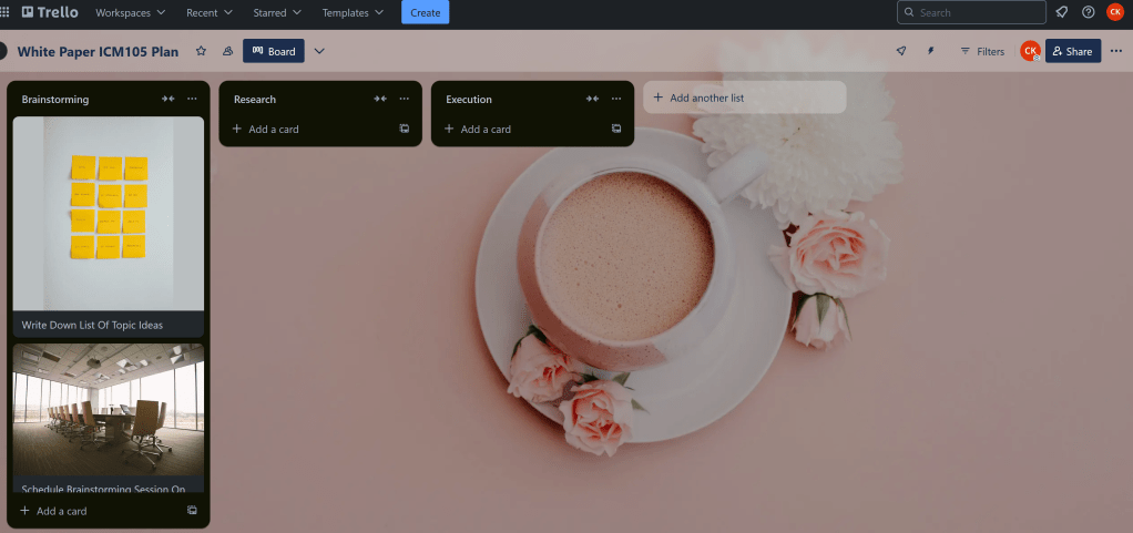 As recommended, I decided to create a project management chart regarding the white paper due at the end of the class. For the software itself, I went with Trello, because I realized when I was watching the video on recommendations for project management programs that I had actually interacted and used it for managing work in an old internship I was in, which was a nice surprise.